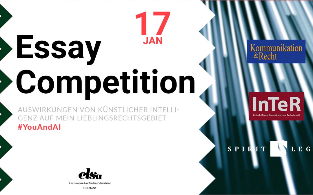 Die Essay Competition 2020 wird im Zeitraum von Februar bis April 2020 von uns in Verbindung mit der Deutschen Fachverlag GmbH und der Kanzlei Spirit Legal Rechtsanwälte veranstaltet.